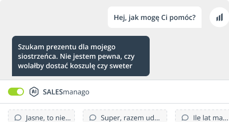 Nasz inteligentny Live Chat działa jak wirtualny asystent sprzedaży. Prowadzi klientów przez cały proces zakupu, odpowiadając na pytania w czasie rzeczywistym i dostarczając spersonalizowane rekomendacje.